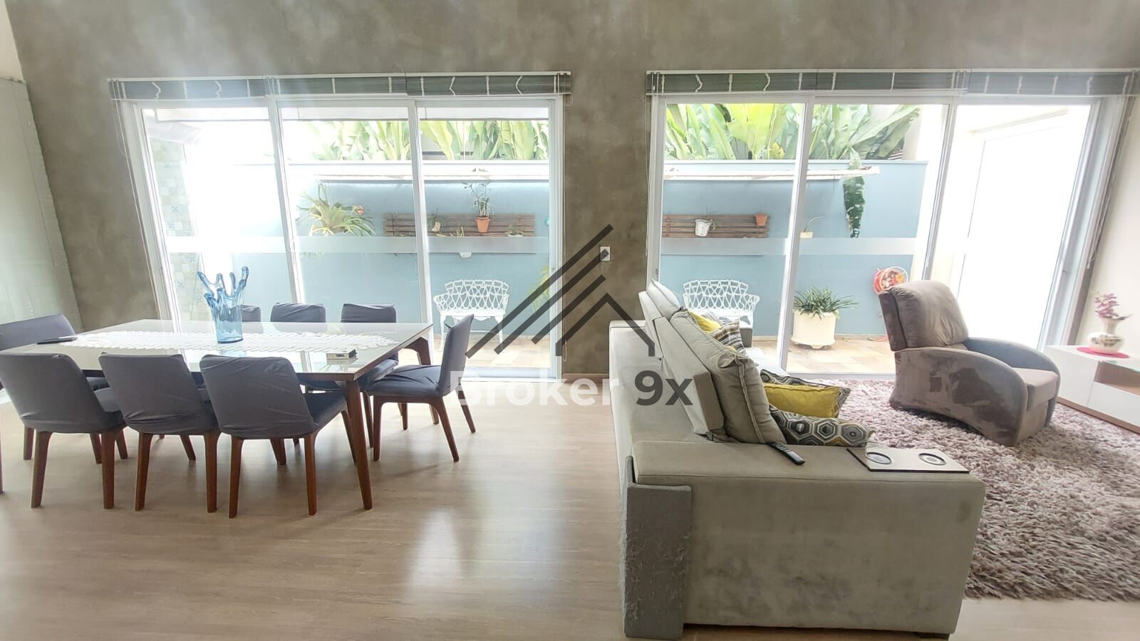 Sala/copa com piso laminado, ar condicionado, integradas com a área gourmet;